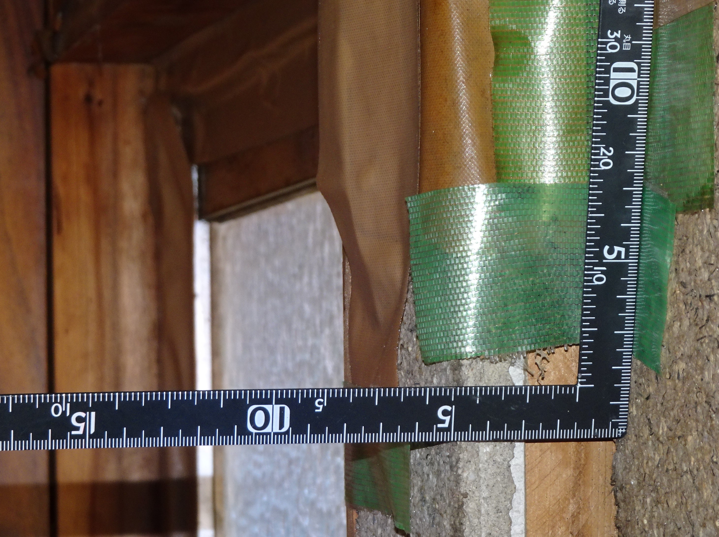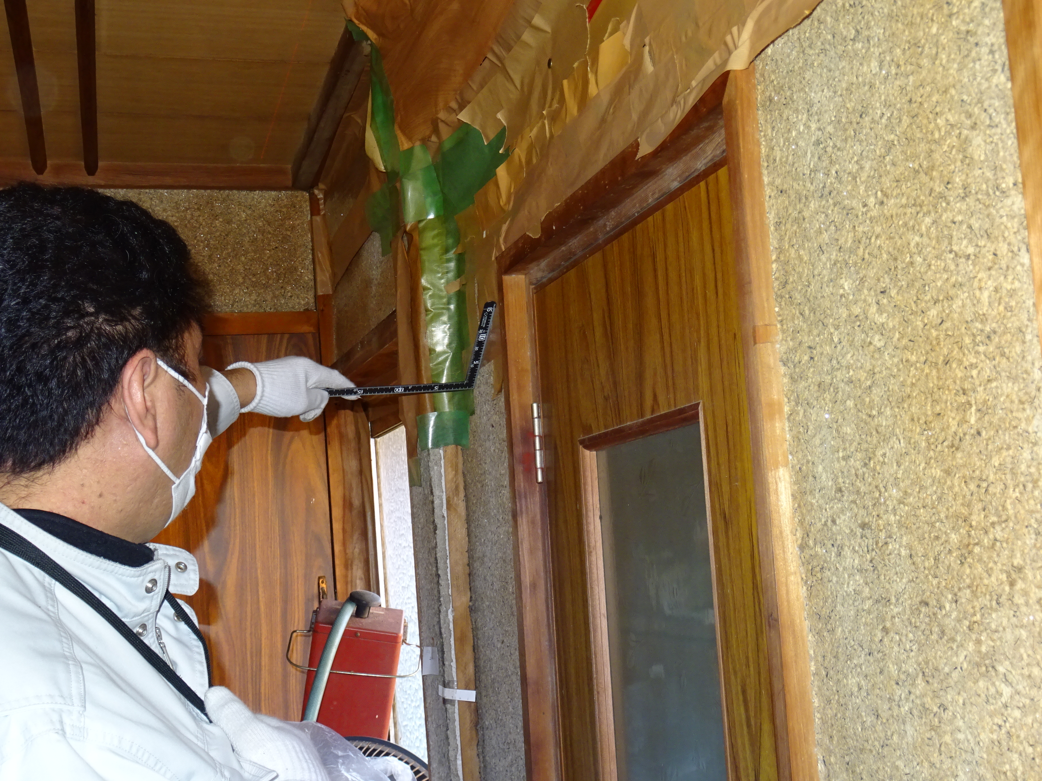 とある住宅の調査風景です。不同沈下により壁面が仕上げ共に大きく傾いている箇所がありました。